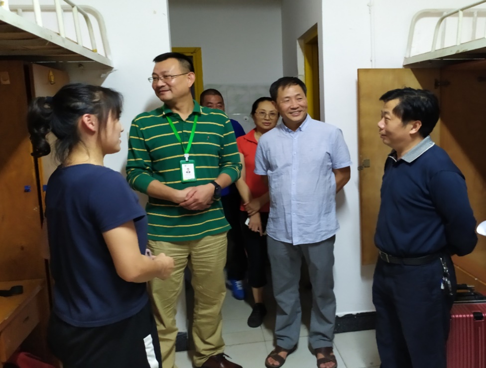 丹桂飘香,又是一年迎新季。在新生来临之际,为了让广大新生能够尽早适应大学生活的氛围,感受到来自学院领导的关怀与温情,9月5日晚8点,体育学院党委书记郑晓康、院长肖旭、党委副书记钟灵波、副院长金萍、体育系主任杨树、学工办主任郭聪、新生辅导员魏崧丞以及学生会代表一起走访了2019级全部新生寝室,与新同学展开了亲切地问候与交流。
