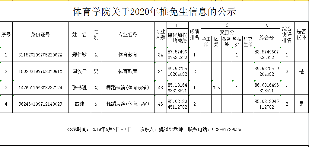 体育学院关于2020年推免生信息的公示