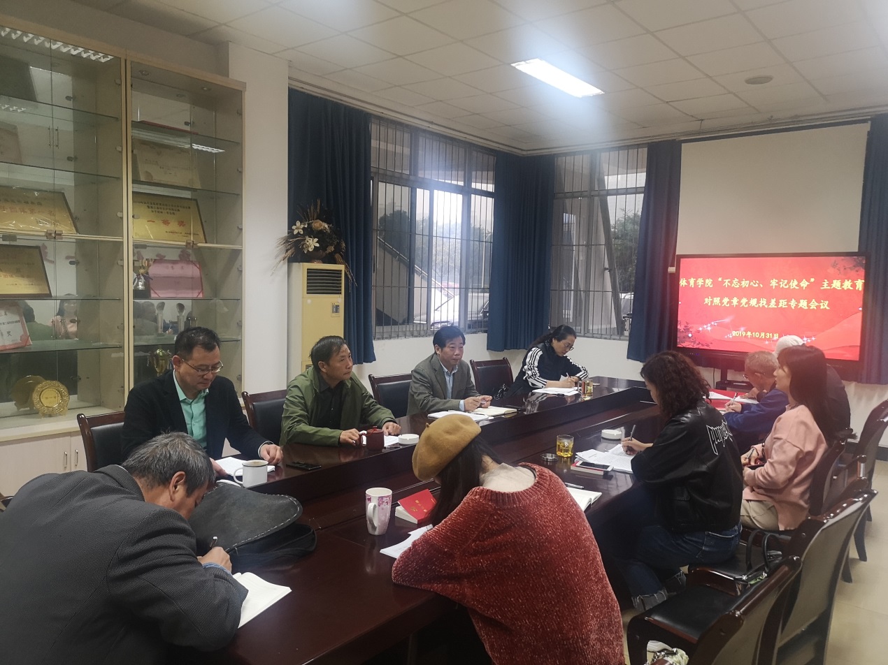 10月31日上午,体育学院领导班子在体育馆小会议室召开“不忘初心、牢记使命”主题教育对照党章党规找差距专题会议暨调研成果交流会。会议由学院党委书记郑晓康主持,学院领导班子全体成员、党委委员、各支部书记参加会议。
