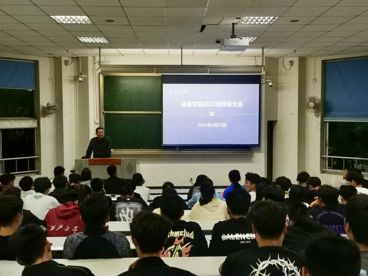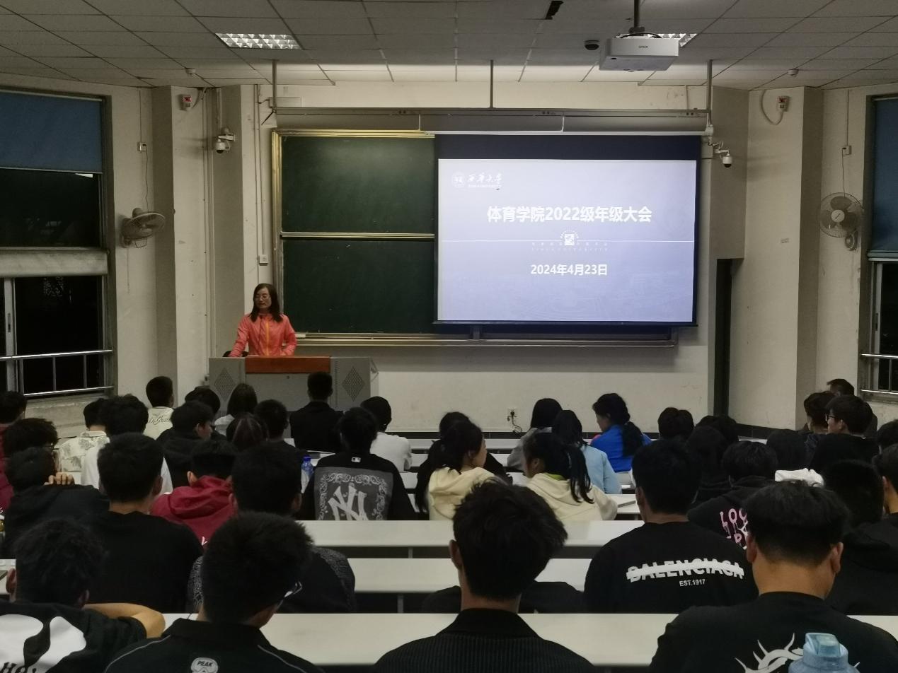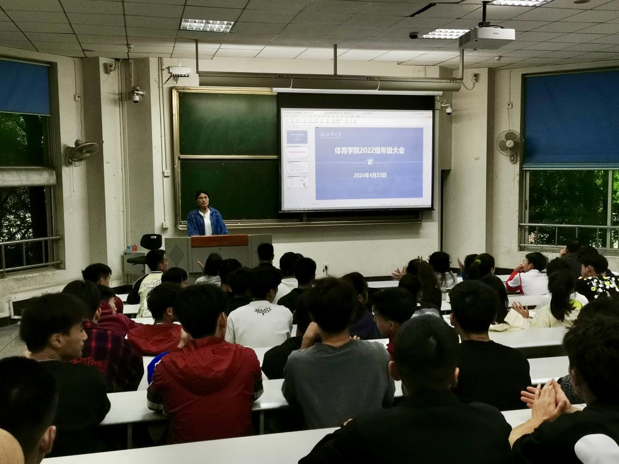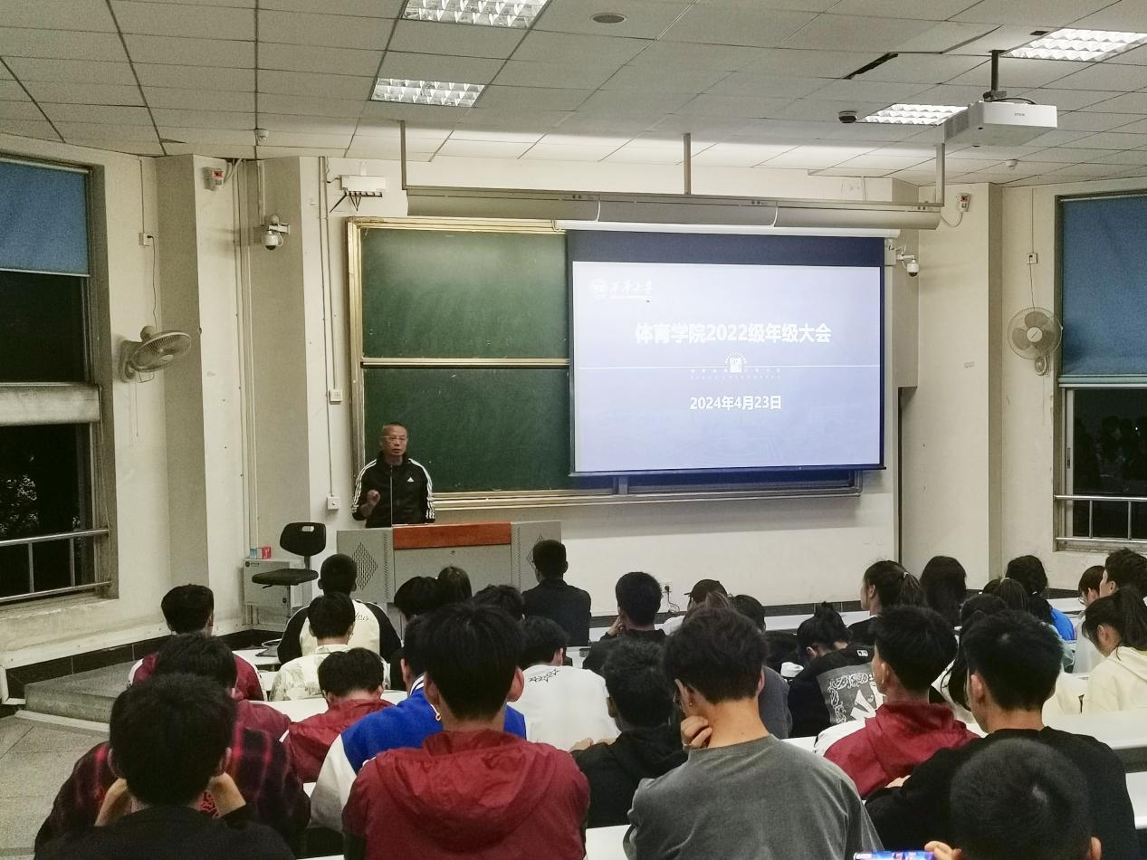 为进一步增强我院体育教育专业学生实践应用能力,落实教育协同创新,强化人才培养,展示我院体育教育专业学生专业技能训练成果,2024年4月23日晚上19:00,体育学院在4A-202举行2024年体育教育专业学生基本功大赛动员会。学院党委副书记钟灵波、副院长何盛、副院长唐觅、体育系主任刘洋、任课老师王伟博士,以及2022级体育教育专业学生参加此次会议,动员会由学工办主任郭聪主持。