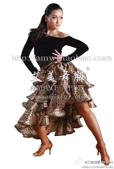女款:黑色拉丁舞上衣或吊带上衣,裙子为大摆豹纹裙