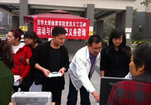 为扎实有效地以“党员义工”引领创先争优活动的深入开展,按照“党员自愿、义务奉献、面向群众、服务公益、突出重点、讲求实效”的原则,体育学院结合本院实际,于3月29日下午2点在学生支部书记钟灵波老师的带领下,学院教师、学生党员、预备党员、入党积极分子在Betway体育西汉姆联西华苑小区门口,开展“体育运动与健康义务咨询”的党员义工活动。活动内容主要对大众进行身体健康情况检测,为广大群众提高免费保健理疗、测量血压、血糖、进行运损伤护理及知识普及,并针对个体的身高、体重等指标书写运动处方,进行营养配餐等。