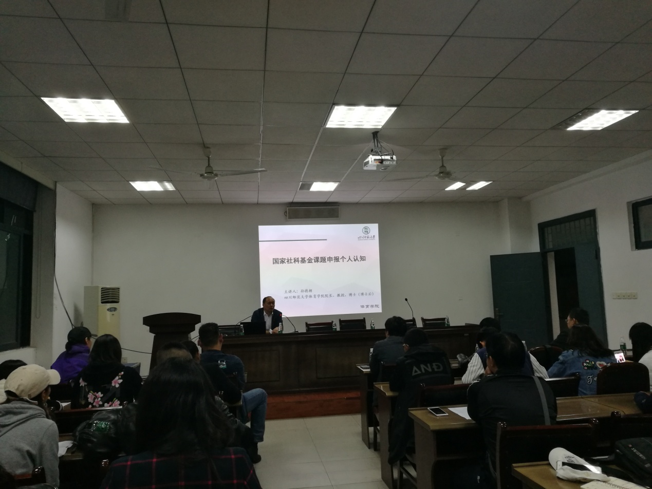 119日晚上19:00,四川师范大学体育学院院长孙德朝教授应邀在6A-520作了题为“国家社科基金课题申报个人认知”的学术报告。体育学院全体教职员工、部分学生参加了报告会,体育学院副院长杨爱华教授主持此次报告会。
