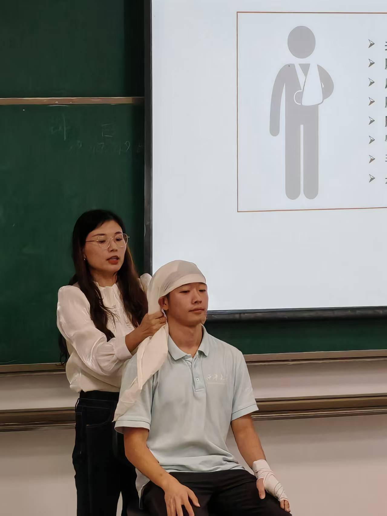 培训围绕志愿服务中可能遇到的创伤场景,重点讲解了止血、包扎、固定等实用急救技术。郭聪老师通过理论讲解与操作示范相结合的方式,详细说明了不同创伤类型的处理原则和操作要点,并指导学生分组进行模拟练习,及时纠正操作细节,确保人人掌握基本技能。