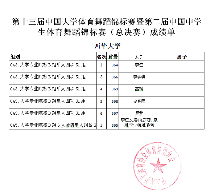 4月28日至29日,由中国大学生体育协会主办,郑州大学承办的第十三届中国大学生体育舞蹈锦标赛总决赛在郑州大学主校区体育馆举行。由我校体育学院费思老师指导带队的6名同学参加了此次比赛,并斩获总决赛大学专业院校B组“6人金牌单人S1组” 冠军,单人四项S1组第1、3、4、5、6名。费思老师获得“优秀教练员”荣誉称号。本次大赛是中国大学生体育舞蹈领域的最高级赛事,去年12月份南北赛区激烈角逐,最终来自全国各地80所学校的1200名选手入围了本次赛事的总决赛。