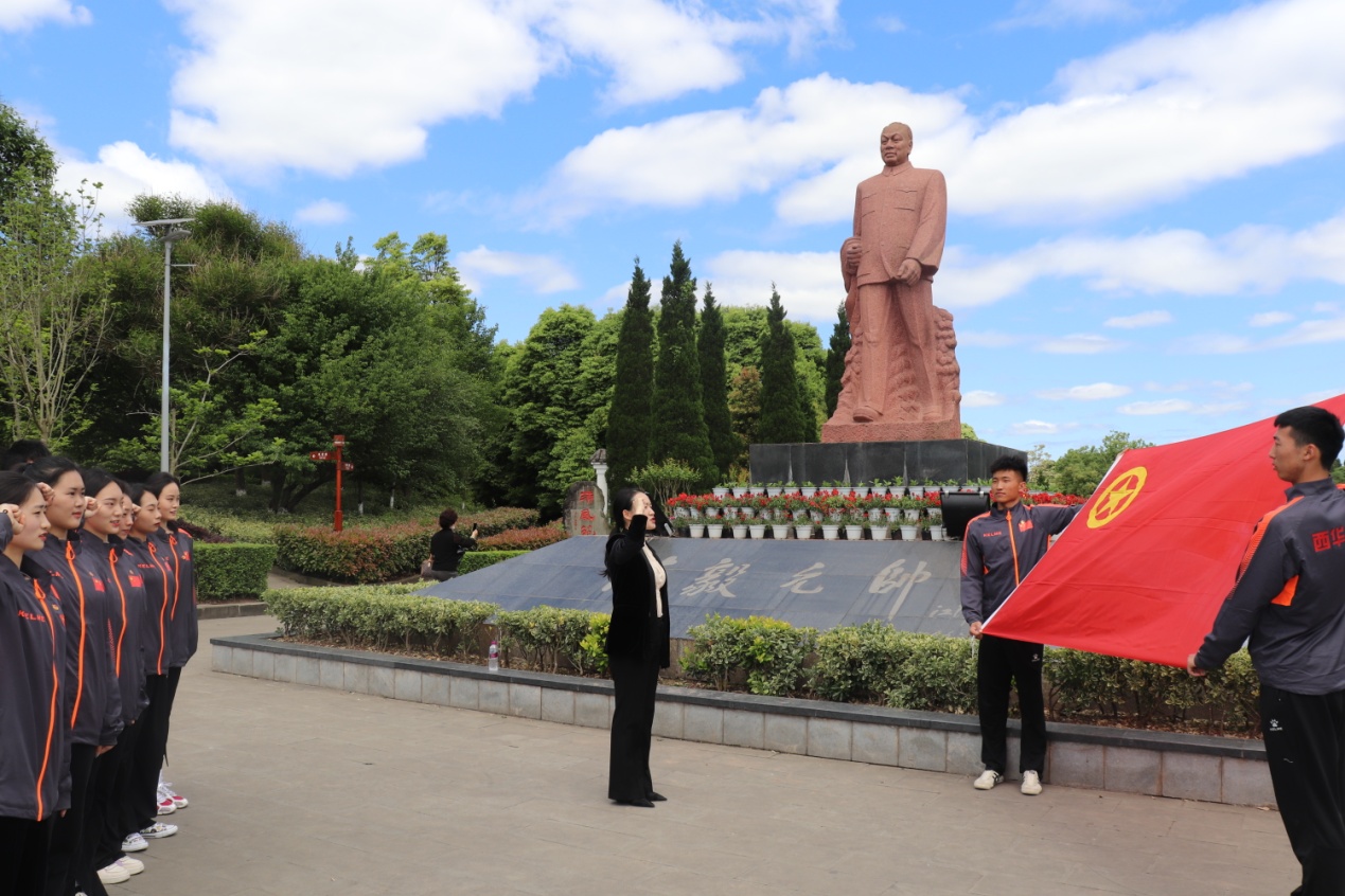 在陈毅元帅雕像前,党委副书记钟灵波介绍了为什么要开展党史学习教育、怎样开展党史学习教育、开展党史学习教育的目标和任务等内容,并希望通过此次团日活动,能让团员青年们加强党史学习,铭记党的恩情,肩负时代责任,努力开拓进取,以优异成绩展现青年担当,向党的百年华诞献礼。紧接着,团学干部代表重温了入团誓词。在鲜红的团旗下,大家庄严宣誓。铿锵有力的誓词直击人心、催人奋进,让每一位团员的心灵再次受到震撼和洗礼。唱支红歌给党听,用激昂嘹亮的歌声,表达爱党爱国之情,让红色基因、革命薪火代代传承。