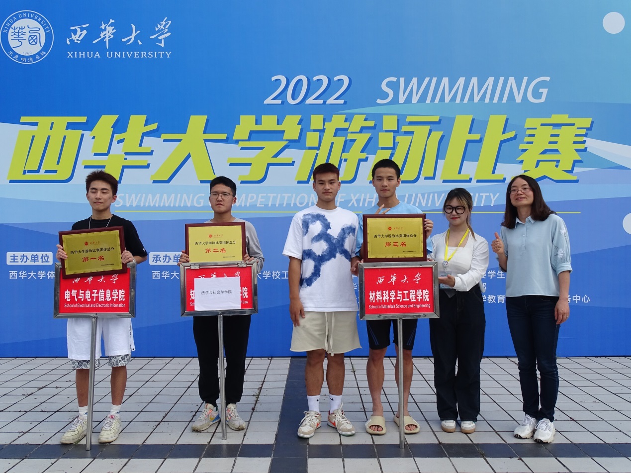 游泳比赛含50米蛙泳、50米自由泳、100米蛙泳、100米自由泳、50米蝶泳、8×50米男女自由泳接力等项目。奔腾的水花、矫健的水中身姿,展现了游泳运动员们激烈的角逐和拼搏的态度,最终,电气与电子信息学院以其昂扬的斗志和不俗的游泳技能,夺得88的总分,荣获学生组第一名;法学与社会学学院总分44夺得学生组第二名;材料科学与工程学院总分31荣获学生组第三名。汽车与交通学院、文学与新闻传播学院、管理学院、大健康管理学院、经济学院分别获得第四名到第八名。