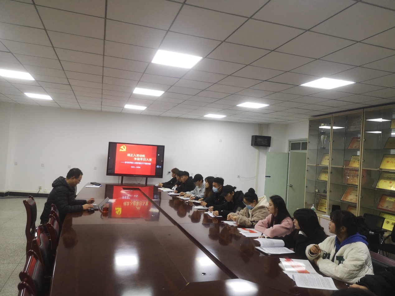 体育学院于2022年11 月 17 日中午在4C205开展入党积极分子培训,学院党委副书记钟灵波为全体入党积极分子上了一堂主题为“端正入党动机,争取早日入党”的党课。