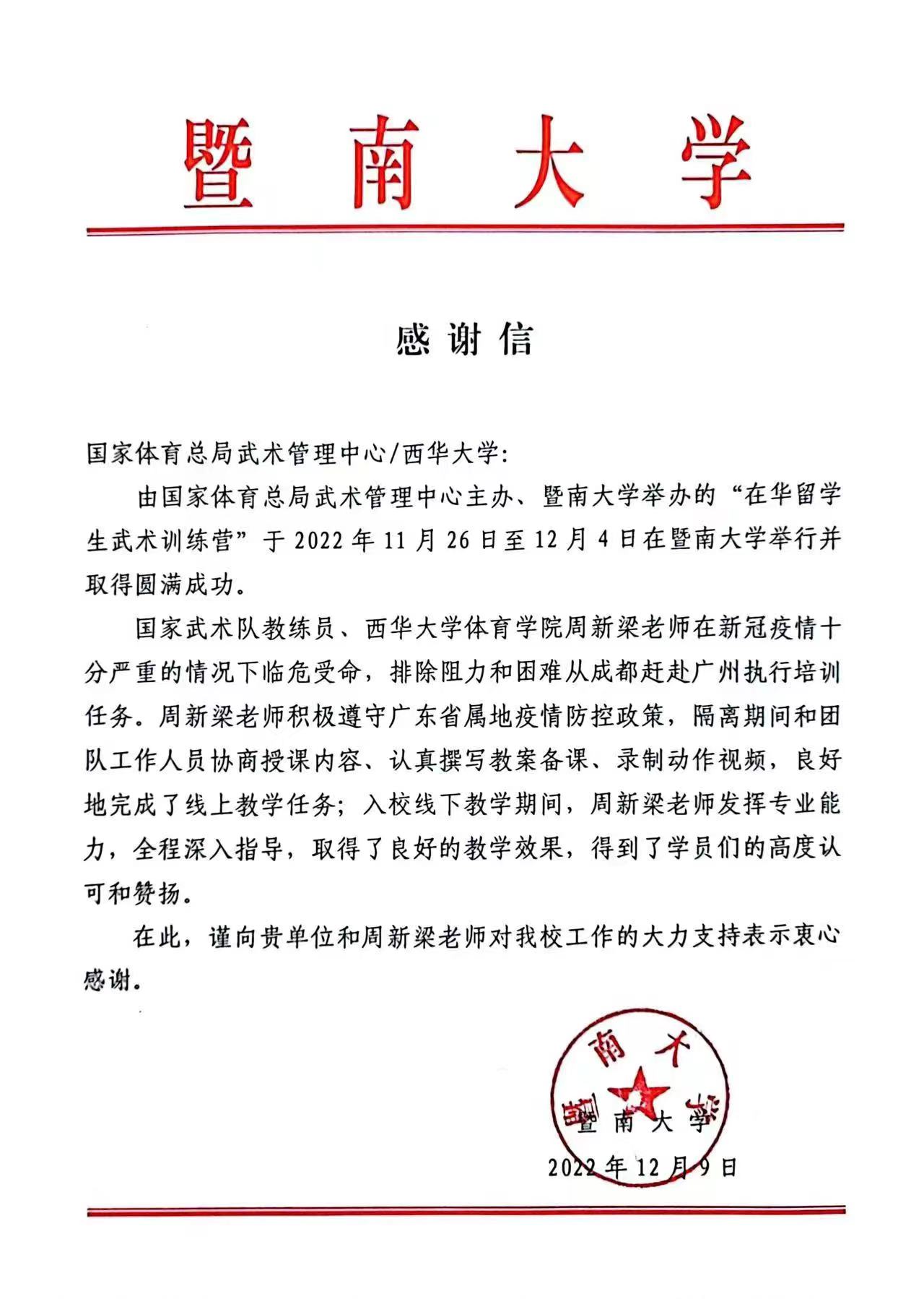 周新梁老师用幽默风趣的教学风格和科学专业的训练方法,赢得了留学生们的喜爱,并向在华留学生们传播了中国传统武术的魅力。为此,暨南大学特意发来一封感谢信,表示对周新梁老师工作的认可,也感谢周新梁老师对暨南大学工作的支持。