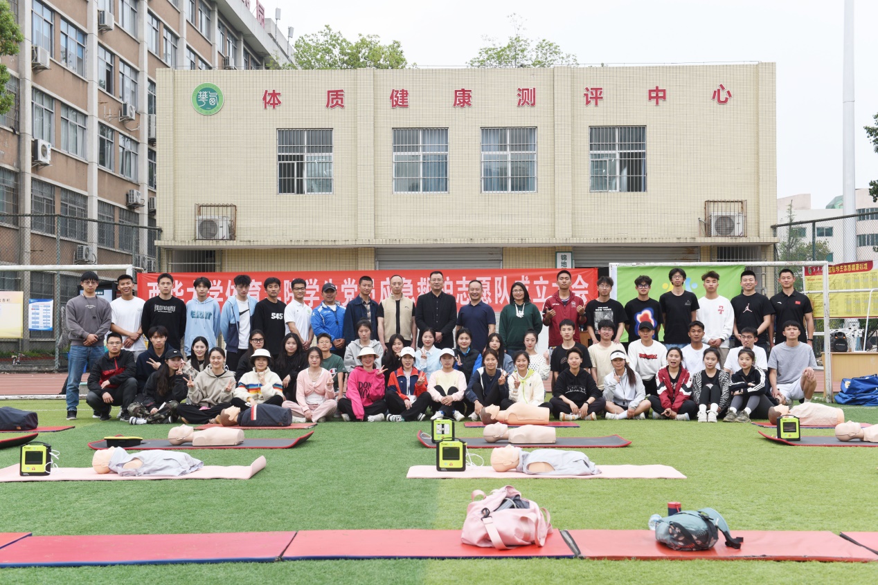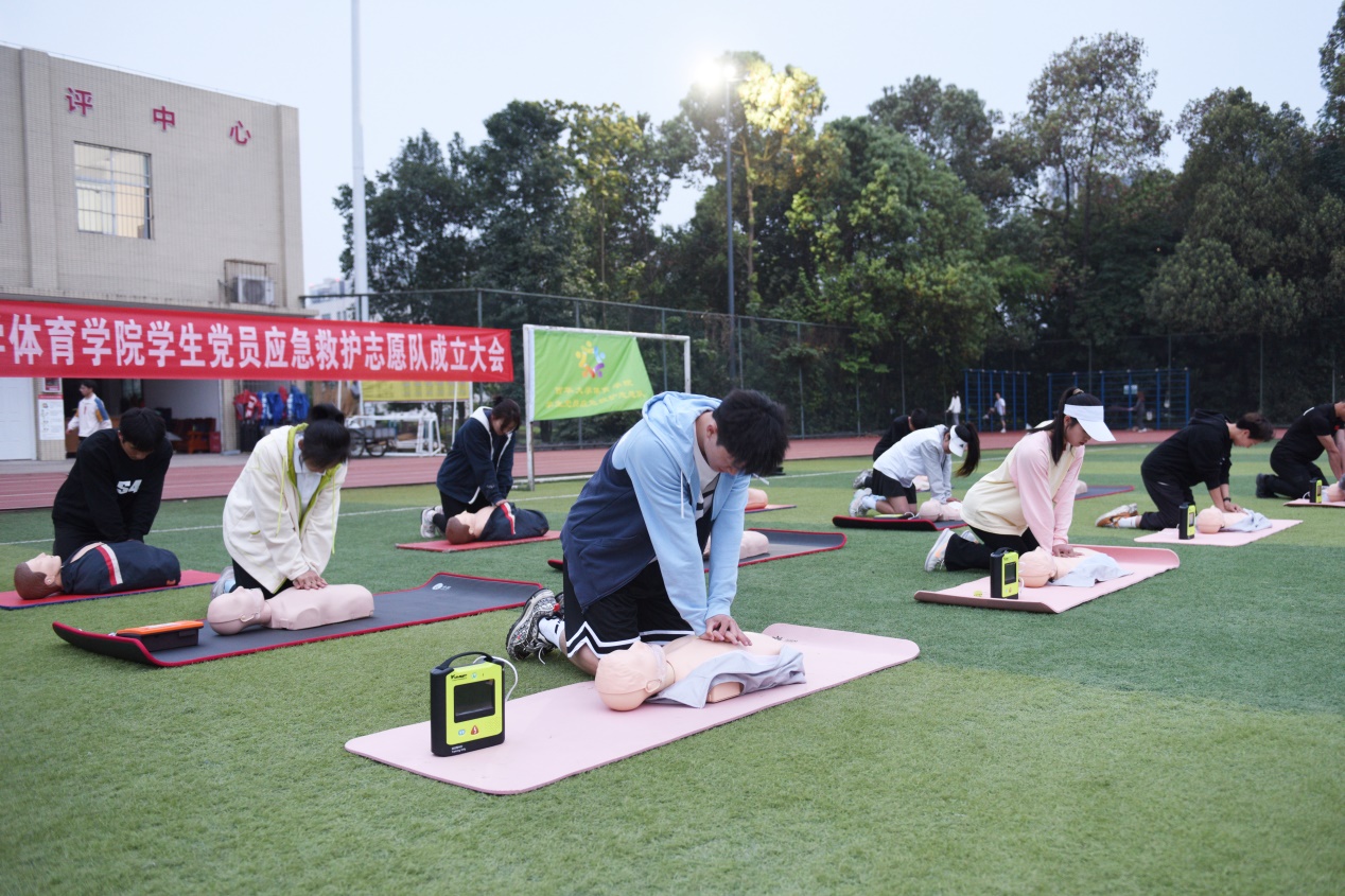 为深入贯彻习近平总书记关于健康中国重要论述和中共中央、国务院下发《“健康中国2030”规划纲要》相关要求,体育学院发挥学院在运动人体科学和创伤急救、心肺复苏等方面的专业优势,发挥党员师生、入党积极分子的先锋模范作用,率先号召成立了体育学院学生党员应急救护志愿队,着力提升校内师生急救教育意识,普及应急救护知识,提高大学生应对突发事件能力与应急救护服务水平,培养乐于施救、敢于施救、善于施救的新时代青年人才。